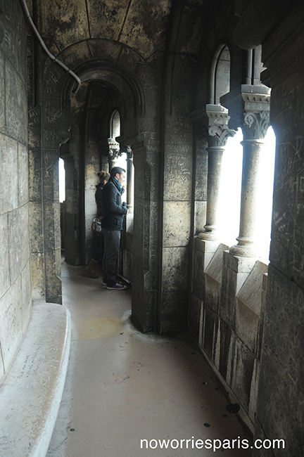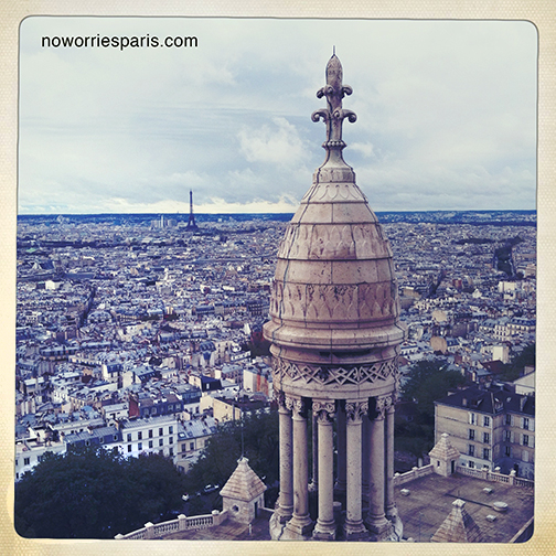 How many tourists realize they can go higher than just the terrace at Sacre Coeur? The line this morning was scant, perhaps because of the season, the wet weather, the time of day (10 am). You can climb to the dome (300 steep curving claustraphobic steps) and crypt for 9 euros or choose just one for 6. The view is staggering and although the walls are scratched with messages and initials (some are love poems), it doesn’t spoil the experience. Photographers, start your engines. Your “No Worries Paris” guidebook will guide you to more adventures behind the Basilica.