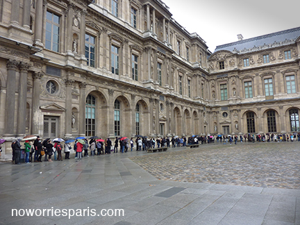 The line snaked for miles in and around the courtyards of the Louvre and people waited patiently under their umbrellas to get in “gratuit” to the Louvre. First Sunday of the month is always free. Mona had more admiring cameras than eyes and flanking her portrait and taking way from her allure, large “beware of pickpockets” signs. Not a very gratifying experience. She’s even behind bullet proof glass now. What would Leonardo think?