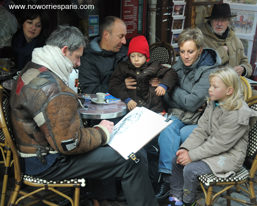 From No Worries Paris, page 134: “The tourist action peaks at Place du Tertre, a fairly large square made intimate by open-air restaurants and an artist’s bazaar that share its center. Some 140 licensed artists hawk portraits, kitsch landscapes, and silhouettes. Village shops and restaurants surround the place, which hums into the night. Chez la Mere Catherine, dates from 1793.”