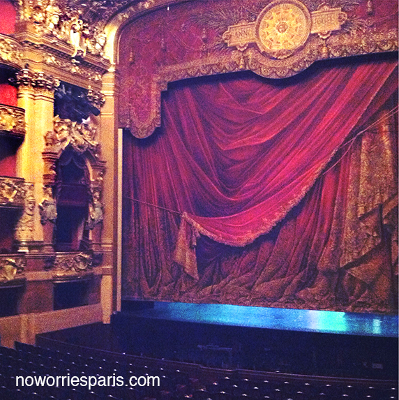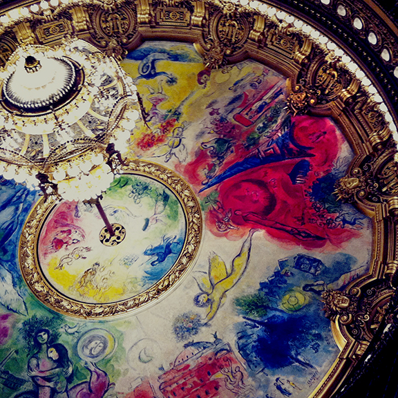 Red and gold, lit by the immense crystal chandelier hanging below Marc Chagall’s brightly coloured ceiling, the Italian-style horseshoe-shaped auditorium has 1,900 red velvet seats. The magnificent painted-canvas house curtain imitates a draped curtain with gold braid and pompoms.