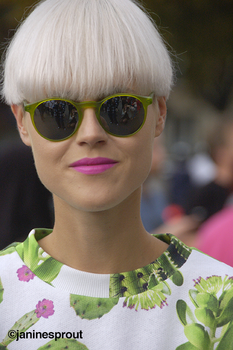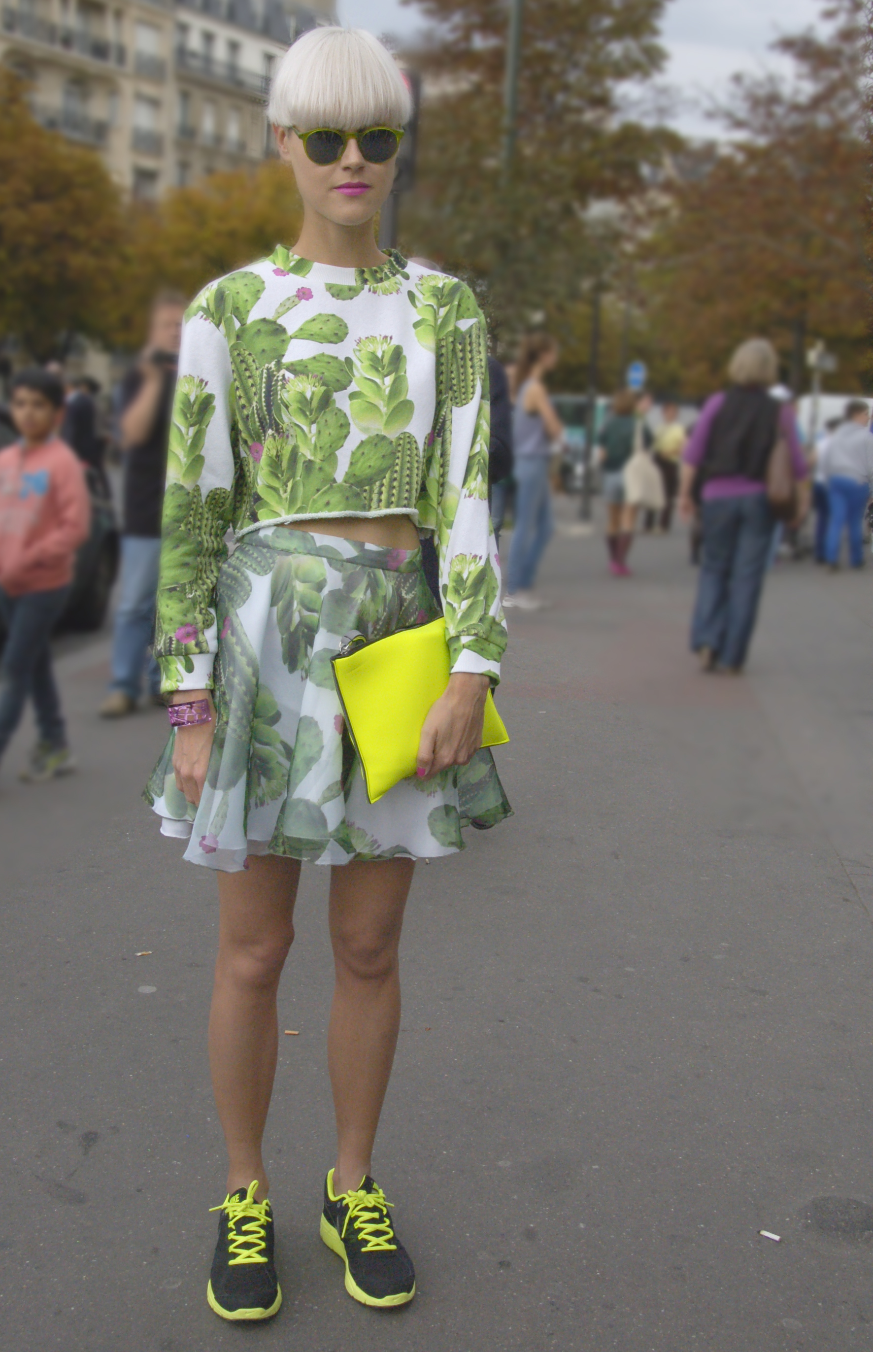 A signal that spring is nearing. Botanical pattern, short midriff, bouncy shoes and round green glasses, the cherry on top.