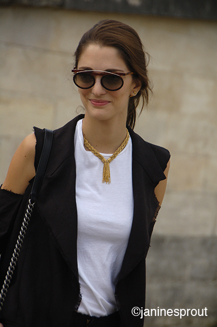 A cut-up spotted during Fashion Week. When in doubt about what to wear and want to stir up a little commotion, go for a peek-a-boo look on the thighs and upper arms. Truly creative. What pulled this all off, the accessories and lovely model. Cool shades!