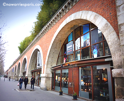 Directly below the promenade is the Viaduc des Arts, some 50 glass-façaded shops occupying many of the 70-plus brick archways of the former railway track. Many of the most accomplished artisans in Paris put their skills and artwork on display. Taken as a whole, the shops perpetuate the cultural and professional heritage of this quartier, the Faubourg-Saint-Antoine, known historically as a birthplace of artistic styles. Stairways lead down to the shops.”