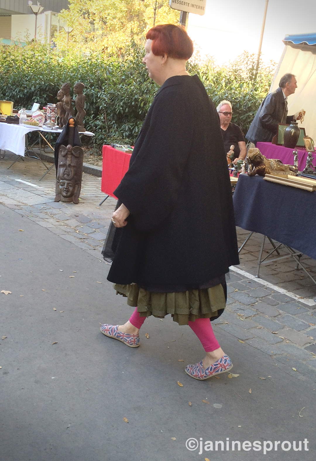 She’s a standout in a crowd, a one-of-a-kind fashion-firster, a person you can’t help noticing because of her eccentric personal style, and it was not once, but twice I caught up with her at two of her favorite haunts – the Vanves flea market and Dior Fashion Week show.