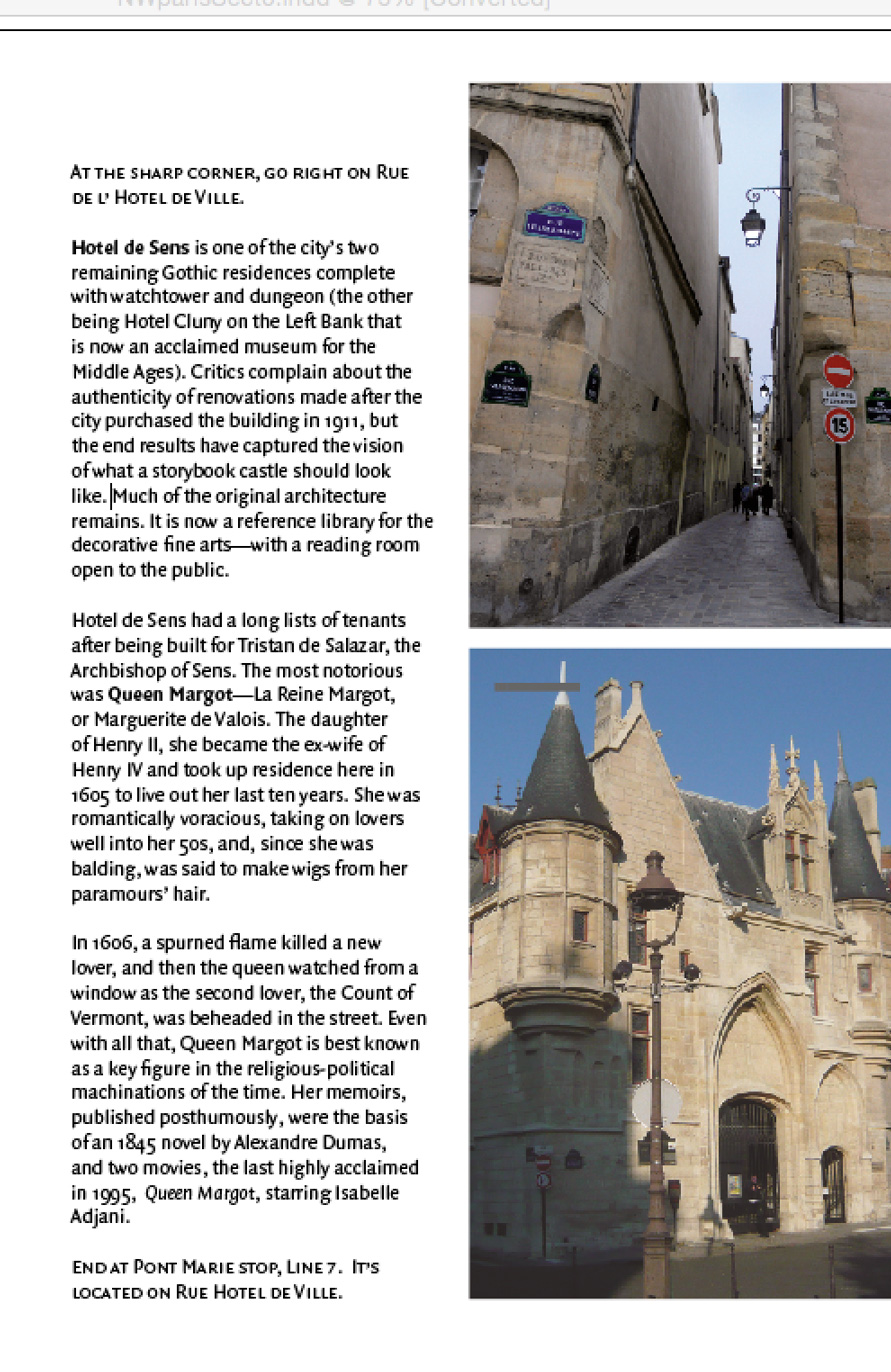 A sample page that takes you on a walk to Hotel de Sens, 1 Rue du Figuier, Paris 4th. This arrondissement oozes history and deserves at least half a day with an accompanying picnic along the Seine.