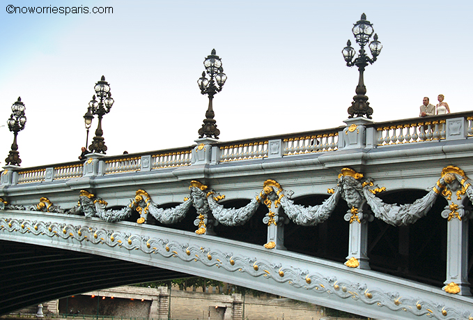 The Universal Exhibition (1900’s World Fair) was being staged on either side of the Seine and a structure for transporting visitors between exhibits was part of the plan. That a bridge be constructed bearing the name of Czar Alexander III was a gesture to encourage the development of a Franco-Russian friendship, a sort of counterweight to the growing might of Germany. The first stone was laid by Czar Nicholas II in October 1896, who followed Alexander III to the throne in 1894.