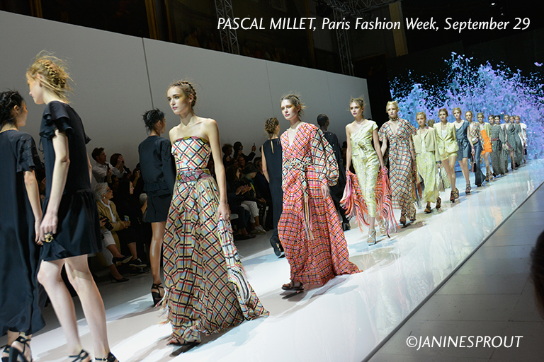 Eleven designers strutted their stuff on September 29, the first day of Fashion Week in Paris. On my schedule was Pascal Millet at the Palace des Beaux Arts. The theme was “Spain of Majarahas”. From their handout: “A feminine summer collection with shades of ‘real Hippie chic’. Mussoline and crepe de chine echo the seersucker and Calais lace for day wear. For evening, there are shirt-dresses in tulle encrusted silk crepe and tea-length dresses in rich pastel brocade and, of course, sexy jupsuits….”